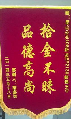 5月21日,公司收到市民陳嘉煒先生贈予公交司機的錦旗。原來,在5月16日,陳先生乘公交108路,不慎將錢包遺丟車上,當(dāng)班司機王寧清掃車廂時,撿到錢包,包內(nèi)有現(xiàn)金800多元及多張銀行