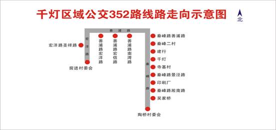 為方便千燈鎮(zhèn)陶橋村、前進(jìn)村村民出行,我公司于2012年12月21日開通千燈區(qū)域公交352路(陶橋村委會(huì)-前進(jìn)村委會(huì)),該線實(shí)行全程一票制:1元/票,首末班為:陶橋村委會(huì)6:40-18:00、前進(jìn)村委會(huì)6:00-17:20,正常班次間隔80分鐘。線路走向如下: