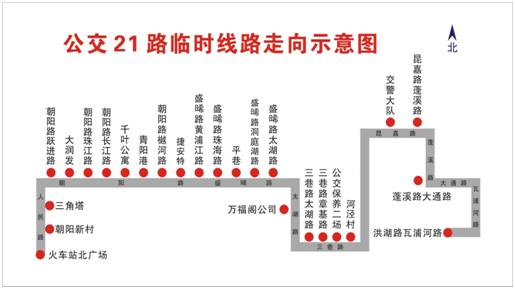 因洪湖路(東城大道以西)道路施工完畢,達(dá)到通行條件,自2016年11月16日起恢復(fù)公交21路該路段走向及站點(diǎn),同步取消公交21路繞行期間臨時(shí)增設(shè)的“盛莊”、“章基”、“昆嘉路東城大道”站,敬請(qǐng)諒解并相互轉(zhuǎn)告!(后附臨時(shí)走向圖)
