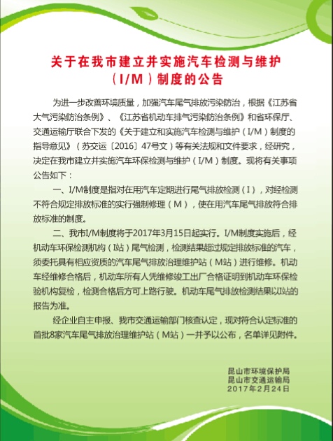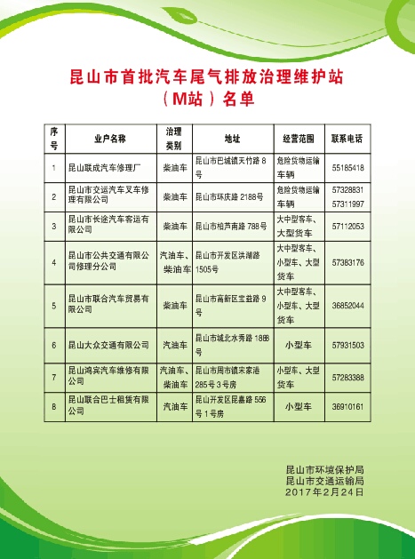 根據(jù)蘇州市環(huán)境保護(hù)局〔2016〕8號文件關(guān)于建汽車尾氣排放治理維護(hù)站(M站)通知的精神,公交修理分公司成功申報(bào)了昆山市第一批汽車尾氣排放治理維護(hù)站(M站)資格。3月15日,M站建成啟用,設(shè)有專用尾氣治理車間和工位和專用尾氣檢測設(shè)備等。