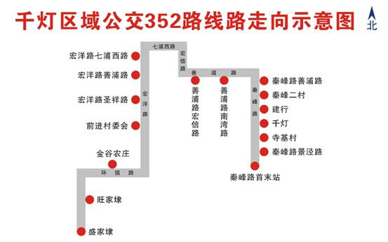 根據(jù)年度公交發(fā)展計(jì)劃,結(jié)合秦峰路首末站啟用,自2017年9月18日起公交352路由“千燈”調(diào)整至“秦峰路首末站”始發(fā),調(diào)整后走向?yàn)椋呵胤迓肥啄┱尽⑶胤迓?、善浦東路、…、盛家埭。同步增設(shè)“寺基村”、“秦峰路景涇路”、“秦峰路首末站”停靠站。(附運(yùn)行走向圖)